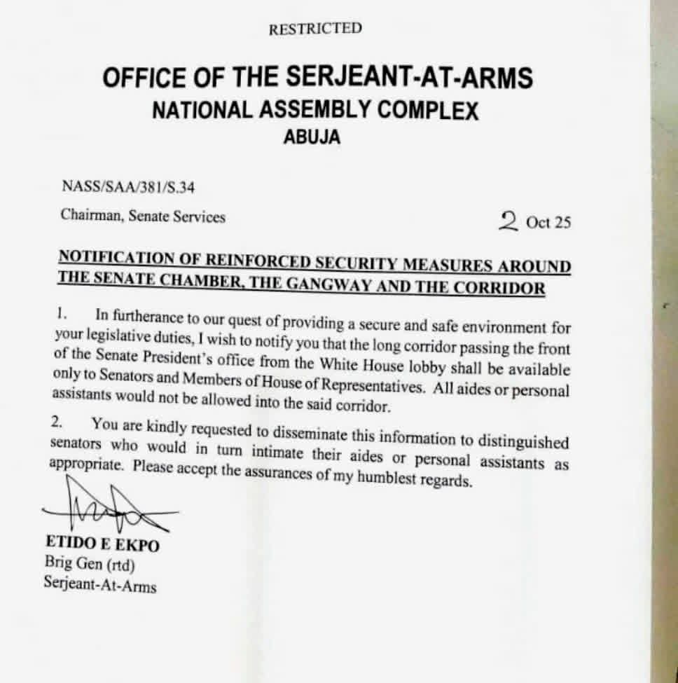 The directive, contained in a memo dated October 2 and signed by the Sergeant-at-Arms, Etido Ekpo, was circulated ahead of the resumption of plenary scheduled for October 7.